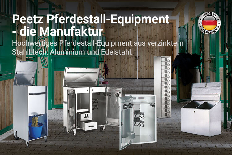 Peetz Reitsport steht für Qualität, Funktionalität, durchdachtes und langlebiges Equipment im Reitsport − mit Fokus auf hochwertige Sattelschränke aus verzinktem Stahlblech oder Edelstahl, Equidenpass-Schränke und praktische Turnierschränke und Turnierwagen. Ob im Stall oder unterwegs zum Turnier − wir liefern clevere Lösungen aus besten Materialien für die Organisation, Aufbewahrung und den sicheren Transport von Sattel, Trensenhalter und Fütterung.